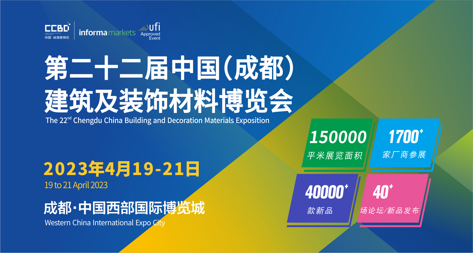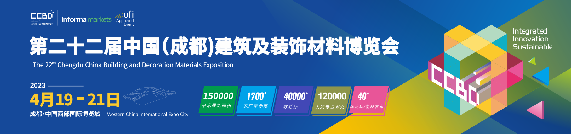 第二十二屆中國(成都)建筑及裝飾材料博覽會,將于2023年4月19—21日在中國西部國際博覽城召開,展會規模15萬㎡展覽面積,展品范圍包括:門窗、定制家居、全屋整裝、頂/墻/地材/軟裝及燈飾、陶瓷/衛浴/石材、智能家居、暖通舒適家居/廚電、建筑新材料及裝配式建筑等行業產品展示為主,預計1700+展商、120000+人次專業觀眾。