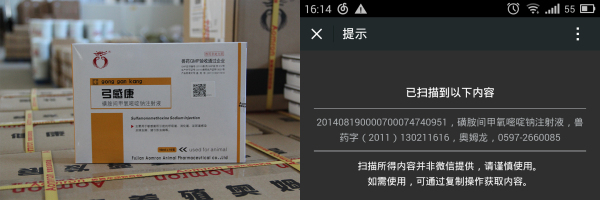 日前,我司接農業部通知赴京參加“國家獸藥產品追溯信息系統擴大試點工作”會議,成為全國首批試行獸藥二維碼監管的108家獸藥生產企業之一。會議結束以后,我司迅速投入準備工作中,組建專項小組,先后投入十幾萬元購置專業設備,改進生產線;經過幾個月的實踐,順利配合農業部完成了獸藥二維碼追溯系統試點工作。目前我司已有多個批次的產品:奧噻林(阿莫西林可溶性粉)、蟲痢康(芬苯達唑粉)、弓感康(磺胺間甲氧嘧啶鈉注射液)與農業部獸藥追溯系統完成匹配。