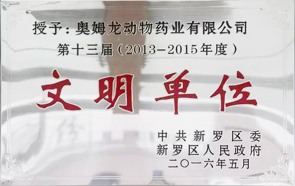 2016年5月,奧姆龍公司喜獲中共新羅區委、新羅區人民政府授予的“第十三屆(2013-2015年度)文明單位”稱號。近年來,福建奧姆龍生物工程有限公司緊緊圍繞全區經濟社會發展大局和工作目標任務,以創建區文明單位為目標,深入持久開展文明創建活動,多措并舉,狠抓落實。公司作風不斷改善,服務水平不斷提高,文明形象不斷提升,工作不斷創新,實現了精神文明創建和企業改革發展雙促進、雙豐收。