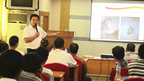 會議上,技術總監郭金權講解病情,為養殖戶排憂解惑。