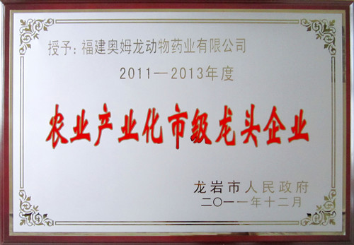根據《龍巖市農業產業化市級龍頭企業認定和資金管理辦法》,在各縣(市、區)上報,市直部門審核的基礎上,經市政府研究,并在《閩西日報》上進行公示,福建奧姆龍動物藥業有限公司成為2011年新認定的農業產業化市級龍頭企業。