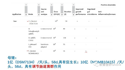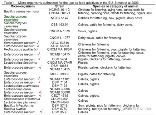 早在2006年后歐盟全面開啟“飼料禁抗”之前,2003年歐盟批了26株益生菌,其中屎腸球菌(Enterococcus faecium)占了10株(見下圖打鉤),是最多的益生菌菌株,涵蓋寵物、豬、禽、奶牛和肉牛。