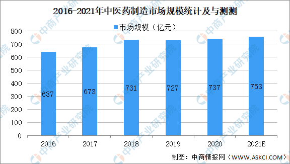 中國是僅次于美國的全球第二大制藥市場。其中,我國中醫藥制造市場從2016年637億元增至2020年737億元,年均復合增長率為3.7%。中商產業研究院預測,2021年我國中藥制藥市場規模將達到753億元,呈上升趨勢。