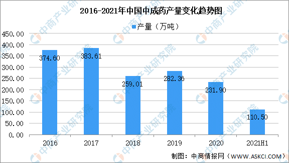 中成藥是以中藥材為原料,在中醫藥理論指導下,為了預防及治療疾病的需要,按規定的處方和制劑工藝將其加工制成一定劑型的中藥制品,是經國家藥品監督管理部門批準的商品化的一類中藥制劑。數據顯示,2021年1-2月我國中成藥產量110.5萬噸,同比增長10.5%。