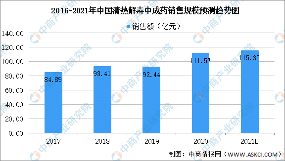 清熱解毒為中醫名詞,清熱解毒類藥物早己被臨床證實確有抗菌的功效,加之其毒副作用較小,被廣泛應用于呼吸系統疾病及消化系統疾病的治療,在臨床使用中長期占據著較為重要的地位。數據顯示,2019年中國城市零售藥店終端中成藥清熱解毒用藥銷售額超過92億元,同比下滑1.03%。預計2021年我國城市零售藥店終端中成藥清熱解毒用藥銷售額將達115.35億元。