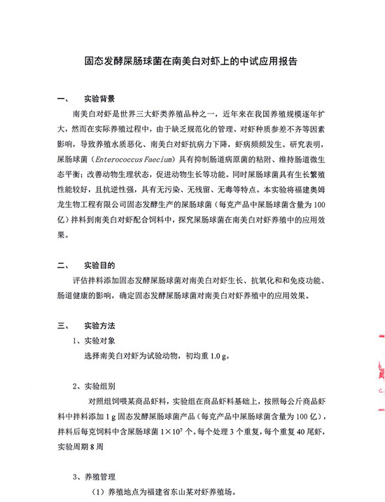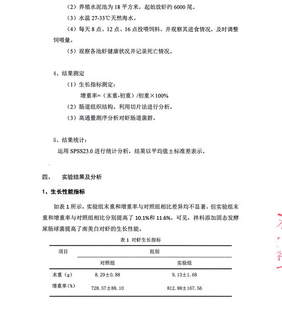 固態發酵屎腸球菌在南美白對蝦上的中試應用結果