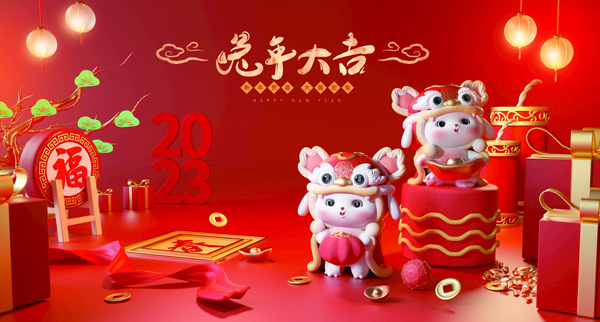 兔年大吉喜氣揚,兔頭揚揚好運來,兔眼圓圓看祥瑞,兔須翹翹錢滿園,兔身擺擺業登高,免尾掃掃體健安,兔聲震震盡歡顏。