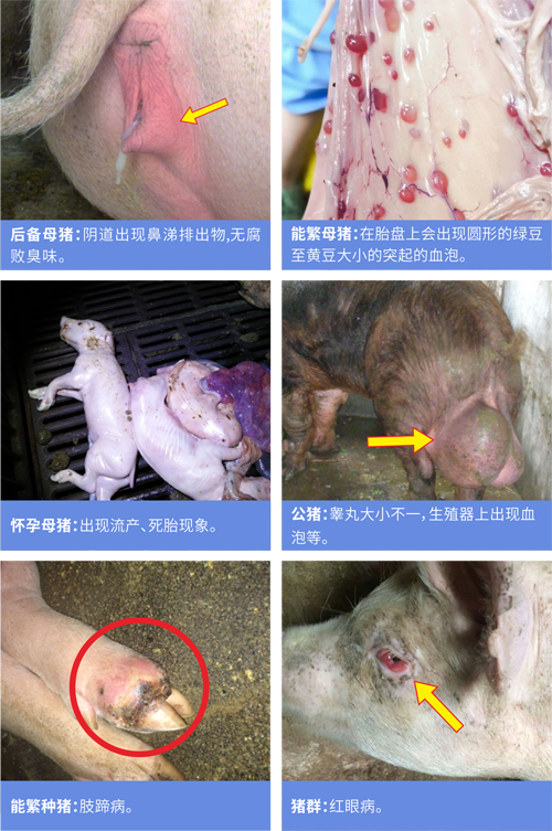 母豬發生流產、死胎、胎衣不下、弱胎和不孕等繁殖障礙性傳染病仔豬發生肺炎、腸炎、多發性關節炎、結膜炎、尿道感染等多種傳染病不同年齡、品種的豬均可感染本病。
