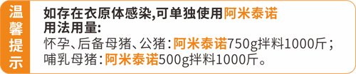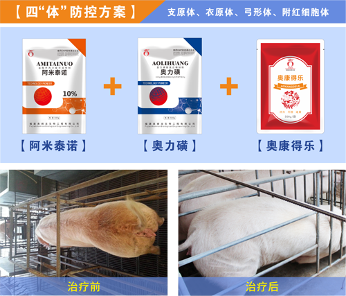 每噸飼料添加阿米泰諾1kg+奧力磺1kg+奧康得樂1kg,連續飼喂15天,治療用量加倍。