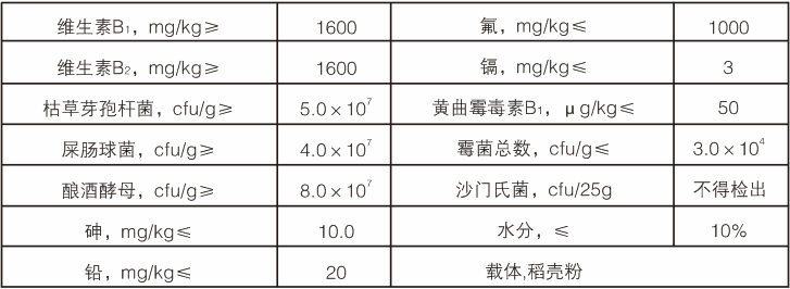 【原料組成】維生素B1、維生素B2、枯草芽孢桿菌、屎腸球菌、釀酒酵母、載體稻殼粉。