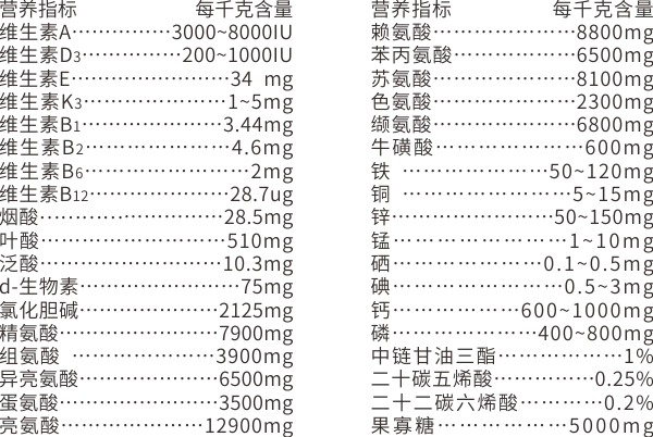 【原料組成 】11種必需氨基酸、牛磺酸、甘油三酯(油脂)、Ω-3(亞麻酸+ EPA+ DHA)、復合維生素、復合微量元素、果寡糖、雞肉粉和奶粉(載體)等。