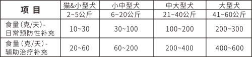 本品可調成糊狀單獨飼喂或和主糧上拌喂,推薦劑量為體重的0.5%(日常預防性補充)~1.0%(輔助治療補充)(或按照食量推薦表)。