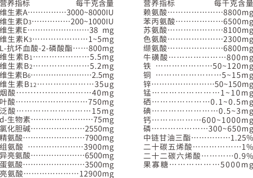【原料組成 】12種必需氨基酸、甘露糖、L-抗壞血酸-2-磷酸酯、中鏈脂肪酸(MCT)、Ω-3(亞麻酸+ EPA+ DHA)、復合維生素、復合微量元素、果寡糖、雞肉粉和奶粉(載體)等。