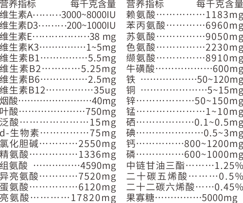 12種貓必需氨基酸、中鏈甘油三酯、Ω-3(亞麻酸+ EPA+ DHA)、復合維生素、復合微量元素、果寡糖、羊奶粉(載體)等。