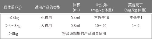 【用法與用量】 以本品計。外用:一次量,每1kg體重,貓0.1ml。預防或治療期間,每月給藥一次。為防止舔舐,僅限于貓頭后頸部皮膚給藥。給藥療程詳見說明書。
